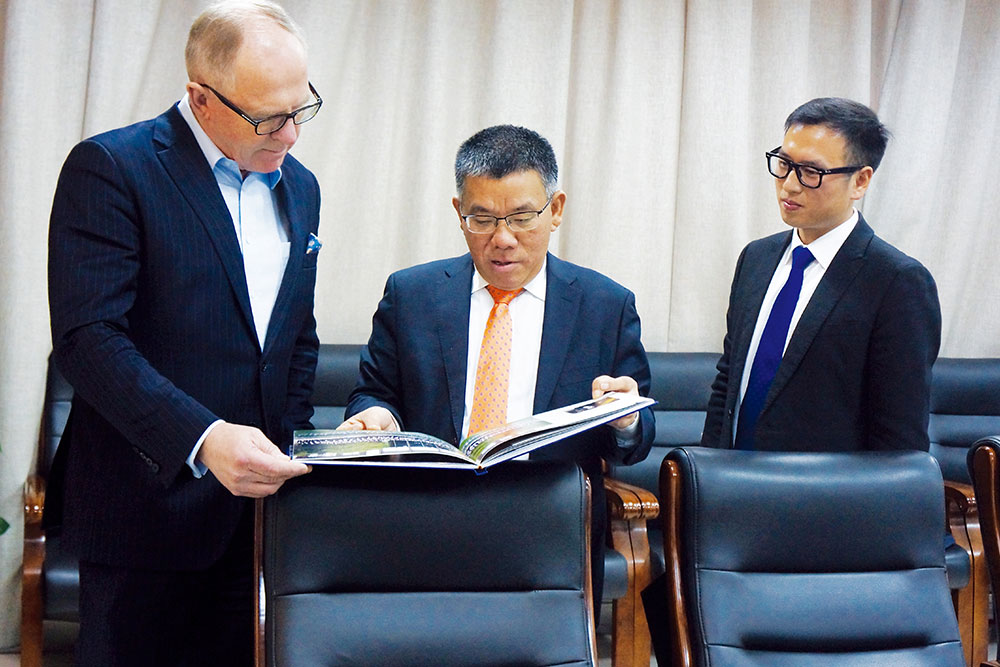 曾光安(中)向Pekka Vauramo(左)展示柳工紀念畫冊