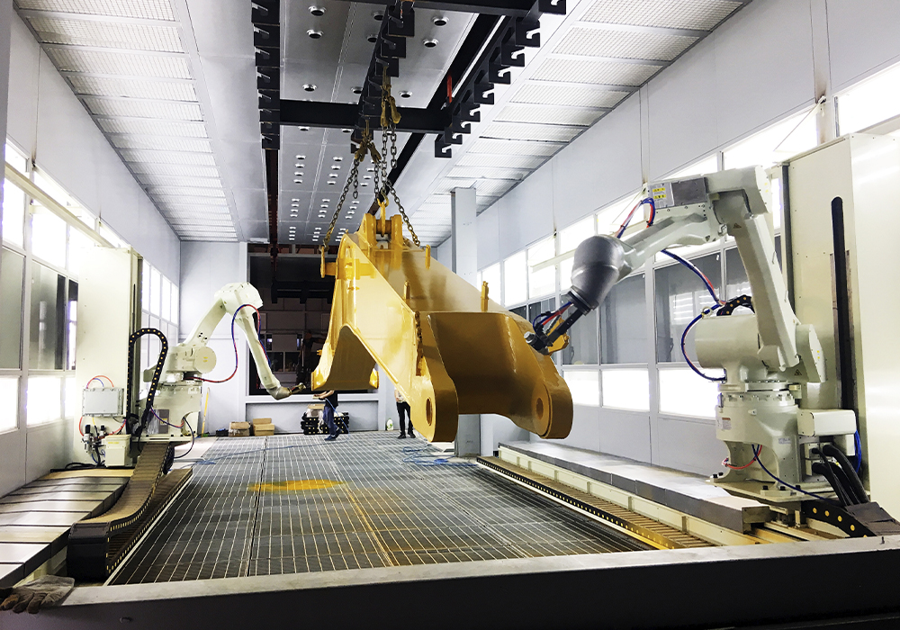 ? ? ? ??此外,挖掘機(jī)動臂斗桿噴涂自動生產(chǎn)線、裝載機(jī)鏟斗焊接自動生產(chǎn)線上,各種機(jī)器人系統(tǒng)正在各條生產(chǎn)線上有序運轉(zhuǎn)。在相同產(chǎn)能下,每班人員僅需2人,人員減少12人,場地減少一半,物料流轉(zhuǎn)次數(shù)減少3倍。
