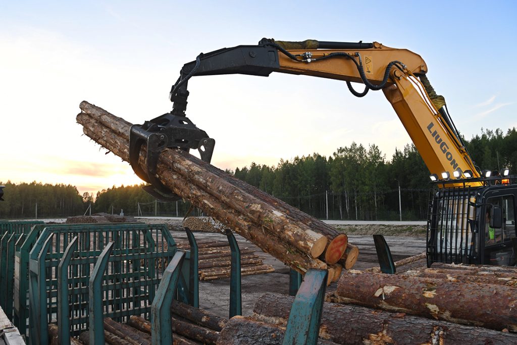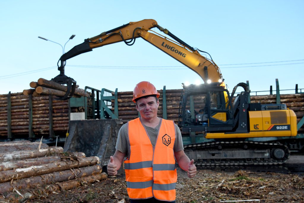 進(jìn)入普列謝茨克,仿佛來到了森林王國,穿過一片又一片筆直的樹林,我們終于看到正在進(jìn)行木材轉(zhuǎn)運(yùn)和裝車作業(yè)的柳工裝載機(jī)、挖掘機(jī)。只見配置抱叉屬具的柳工856HMAX裝載機(jī)將原木堆放成整齊的“小山”,柳工922E挖掘機(jī)嫻熟地將7-8根原木抓起,裝入旁邊專門運(yùn)送木材的火車車廂,只需幾分鐘就能裝滿一車廂。